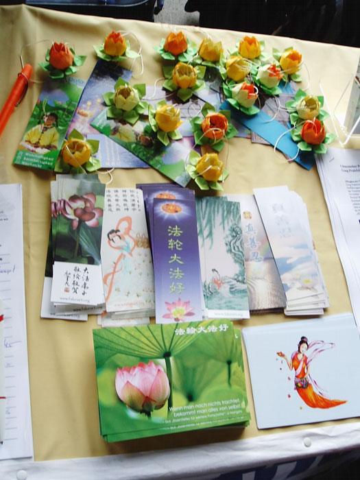 很多大学生听到是为制止人权迫害签名,立即决定贡献自己的力量,还介绍他们的同学都来签名。也有不少大学生看到了展示法轮功学员在中国受到惨无人道的酷刑迫害的画作后,主动签名帮助被迫害人士重获自由。也有大学生受到中共在海外散布的谎言的误导,对法轮功有误解,但是经过讲清真象,表示能够理解。有的静静的站在酷刑图片和说明前面,沉思着。有意思的是,展台前不时传来德国口音的“法轮大法好”。原来大学生们签名后,得到一份小纪念品- 书签或明信片。他们都不约而同的觉得上面的中文字很美,好奇的提问并学着念。