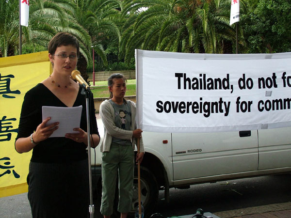泰国总领事布亚曼纳普(Boonyamanop)先生会见了约翰•戴乐等法轮功学员代表,接受了学员递交的公开信,并耐心的听取了他们的关注。总领事表示泰国是个独立的国家,泰国法轮功学员有权在中领馆前和平抗议表达自己的意愿。据悉,同一天堪培拉和维多利亚省的法轮功学员也到当地的泰国使馆和领馆举行集会,并向泰国驻外官员递交了公开信,表达对泰国警方受中共指使非法抓人事件的严重关注。