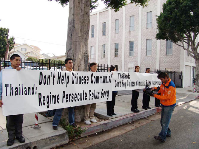 前往抗议的法轮功学员在泰国领事馆前打出“泰国:不要帮助中共迫害法轮功”的横幅。加州大学洛杉矶分校(UCLA)副教授吴英年代表法轮功进入领事馆递交了抗议信和中共迫害法轮功的真相资料,并向接收抗议信的泰国领事Som Pop Sermswatsri 介绍了事件的经过和中共迫害法轮功的事实。希望泰国政府和人民主持正义,不要帮助中共迫害法轮功。泰国领事表示会向政府转达法轮功的要求。一位路过的泰国电视台记者对整个过程进行了详细采访。