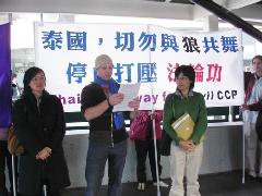 当天下午,一批法轮功学员举着抗议的横幅,从中环遮打花园出发,游行到泰国驻香港总领事馆所在的大厦。学员在领事馆外的人行天桥上宣读公开信,指中共当局通过外交与经济渠道,向世界各国延伸对法轮功的迫害,损害这些国家的法律与道德基础。对于泰国当局不顾本国的友善形象及人民福祉,屈从于中共压力并听其指使,表示遗憾及抗议,并要求立即释放被拘押学员,停止对法轮功学员的人权侵犯及公开道歉。