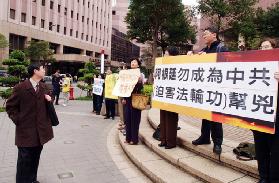 ![]() 民众经过法轮功请愿横幅前,好奇的看着展板内容 |