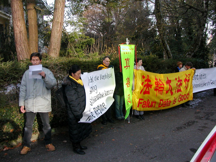 12月22日下午,瑞士部份法轮功学员冒着严寒在阿根廷驻瑞士大使馆门前举行活动,抗议中共当局在罗干访阿期间,竟然在阿根廷的国土上指使坏人公然暴力攻击和平抗议的法轮功学员。并呼吁阿根廷政府不要被中共的谎言所蒙蔽,更不要因为经济的原因,就屈服于中共压力,放弃自己的人权原则,希望阿根廷政府能够帮助制止这场对法轮功学员的迫害。法轮功学员代表分别用英语和德语宣读了公开信,并将公开信面交接待人员。阿使馆接待人员表示,他会将公开信及法轮功学员代表所说的情况如实上报。