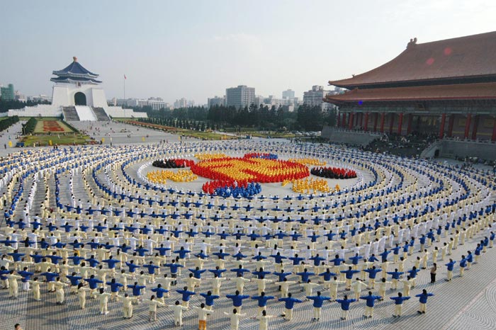 继1998年广州学员排组法轮图形,时隔七年,四千余人排成的法轮图形再现台北,震撼人心。在中共下令镇压法轮功前,大陆各地的集体炼功活动,场面也曾是如此盛大。在中共仍残酷迫害法轮功的今天,台湾学员排出法轮功的标记“法轮图形”,呈现海外各地自由学炼的盛况,也给予大陆法轮功学员积极声援与精神支持。