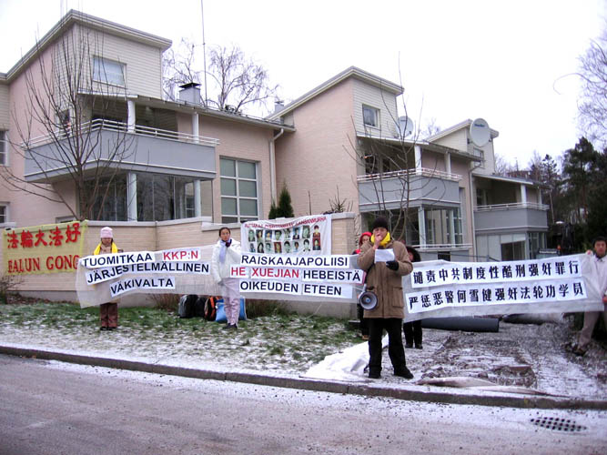 同时法轮功学员在中使馆前还用中、英、芬文宣读了《法轮大法学会公告》。这份10月9日发表的公告说:从即日起,(中国)各省市的主要官员及中共头目如再有参与或继续迫害法轮功者,从事新的犯罪行为,一旦其离开中国大陆,将受到世界各地法轮功学员原告的刑事起诉和民事控告,追究其刑事责任,并寻求经济赔偿。