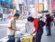 一次碰到四个穿着新潮的年轻学生,向他们派发真象资料时,他们拒绝了。可我并未放弃,当看到有一个女孩子还在频频回头向展板上看时,就走过去聊了起来。得知他们是来留学的南韩学生,今天上街游玩。她用并不流利的英文问我,这儿到底发生了什么?我有意放慢语速,告诉她法轮大法在南韩,乃至全世界广受欢迎,然而法轮功学员们却正在中国受到摧残的事实,现在这里模拟的只是冰山一角。女孩眼含泪水听着,最后问道,我能做些什么?我告诉她有几种方法可以帮助制止迫害后,她表示一定要去告诉朋友们事实真象。问清了在哪里填写征签表,她招呼另外几个同学,一起签了名。