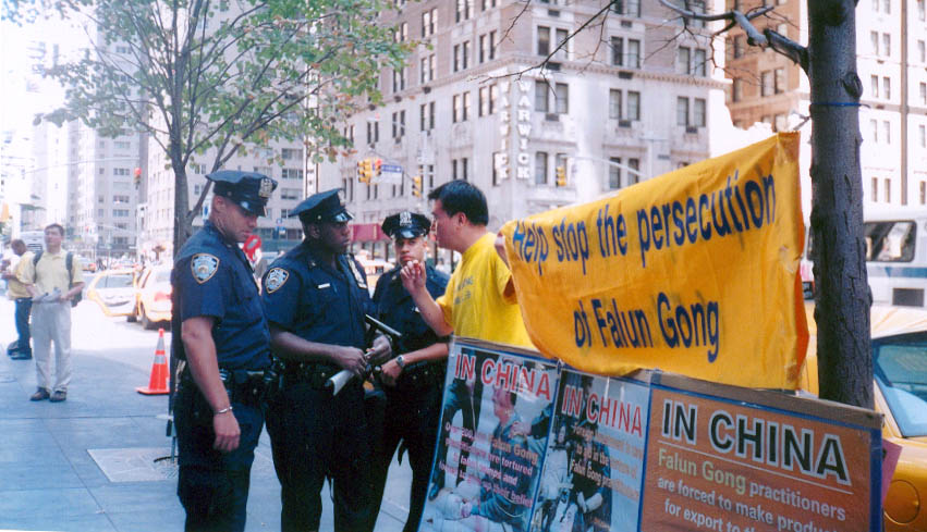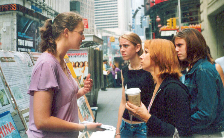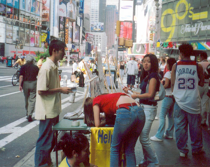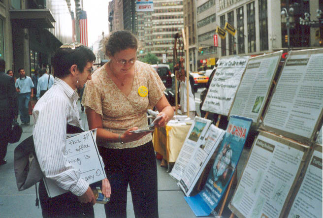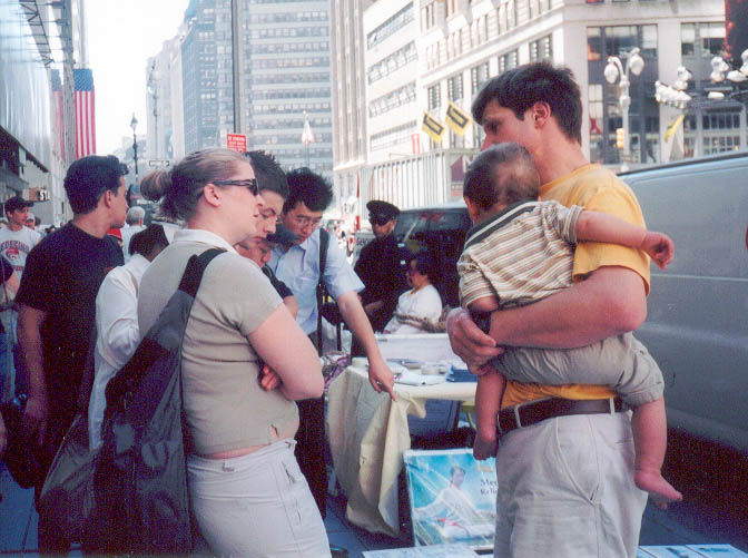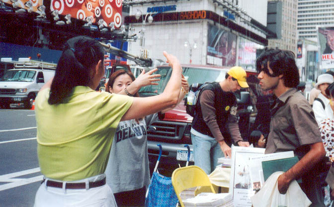澳洲大法弟子与其它地区弟子们配合,以多种形式向人们讲述着正在中国发生的迫害真象。与纽约的反常酷热相反,曼哈顿街头匆匆走过的人们,大多数都是一脸冰霜,神情冷漠。起初感觉在纽约讲真象真难啊。我曾经见到一个同修在回答常人的问题时,叹了口气,拿起一份真象资料,用手一行行指给那人看。当时我想这位同修也许英文不好,就接过去讲了起来。后来看到这位同修讲真象时,英文相当流利,就明白了当时他是太累,连张嘴的力气都没有了。也许是为了印证我这个猜测,过了两天,资料桌上多了个当地同修给拿来的能放真象录音的扩音器。