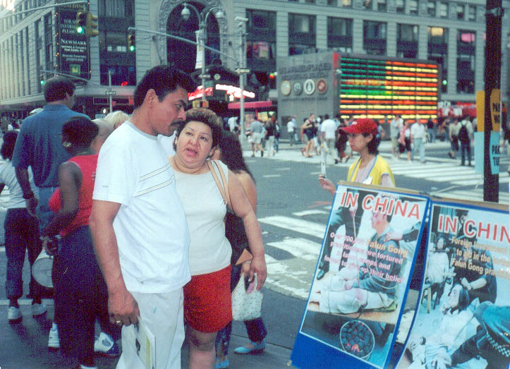一次我们在第七大道38街上举行反酷刑展,正在布置道具与展板时,忽然听到一阵哇哇的叫声,开始以为谁在捣乱,跑过去一看,原来是位聋哑人,眼睛含着泪水,对着展板上被迫害的法轮功学员图片神情激动的挥舞双臂,嘴里还在不停的呜哇说着什么。估计他是震惊于这些迫害事实,同修们给他拿来了征签板,他签下了自己的名字,手里比划了一些什么,就走了。过了近一小时,他又来了,是与两位朋友一起来的。他领着他的朋友到了资料桌前,指着征签板让那女孩签名,然后又把她领到展板前让她看,似乎还在讲解着。等他们三人走后,大家都很感慨的说,他有一颗良善的心呀。