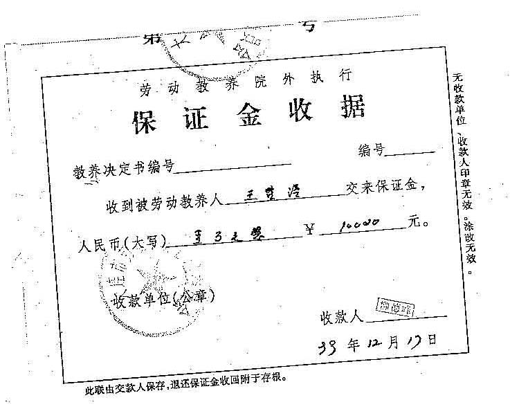 由于不法人员不断的骚扰,王哲浩被迫辞了职,并搬家。99年10月初,大连五一广场派出所到家里骚扰,找他们要找的人没找到,随后把王哲浩及其母亲绑架,非法拘留了15天。随后又把他送到戒毒所继续关押迫害。一个月后又直接送到大连教养院非法劳教一年。由于亲属找关系把王哲浩接出,公安局要押金10000元,至今未还。