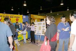 游客喜气洋洋,在各个展位之间来回穿梭。在闹闹攘攘的气氛中,游客来到法轮功展位前,这里却有一片宁静,英文、中文和越文“真、善、忍”横幅吸引了游客的注意,让人耳目一新,展位有介绍法轮功的图文并茂的展板、提供越语、中文、英文的各种资料、VCD.游客不愿错过良机、不断的有游客询问、索取真象资料、观看法轮功学员炼功、有的打听在哪里可以学功。