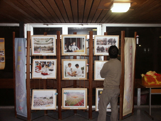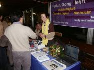 学员们用横幅、传单和真象光碟向人们介绍法轮大法和在中国发生的对法轮功学员的迫害。一个小图片展板简单介绍了关于这个修炼功法的故事:法轮功1992年在中国开始洪传,获得无数褒奖并广受民众欢迎;1999年中共前领导人江泽民出于妒忌和怕失去权力的恐惧,无端的禁止了法轮功,还对无辜的中国法轮功学员实行群体灭绝。