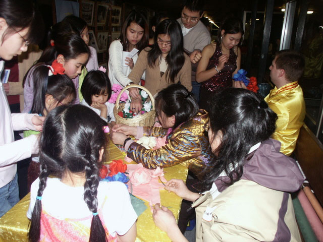 学员们用彩纸手工折叠的莲花很受游客们的喜爱。常有一大群兴致勃勃的孩子来跟学员学折莲花或帮忙把莲花赠送给游客们。