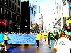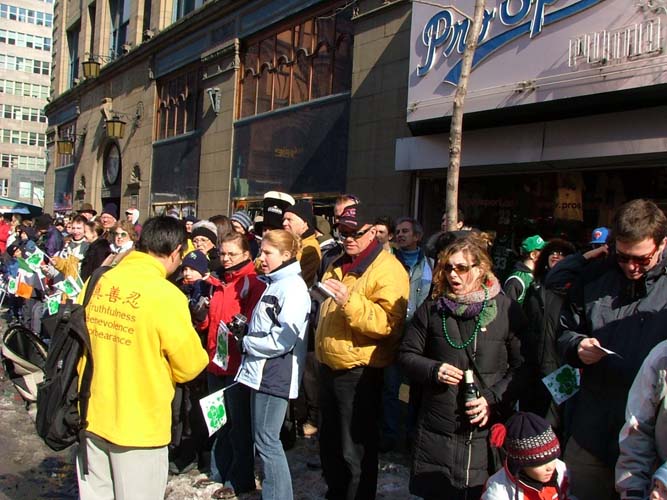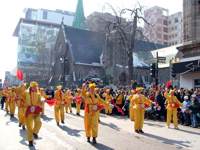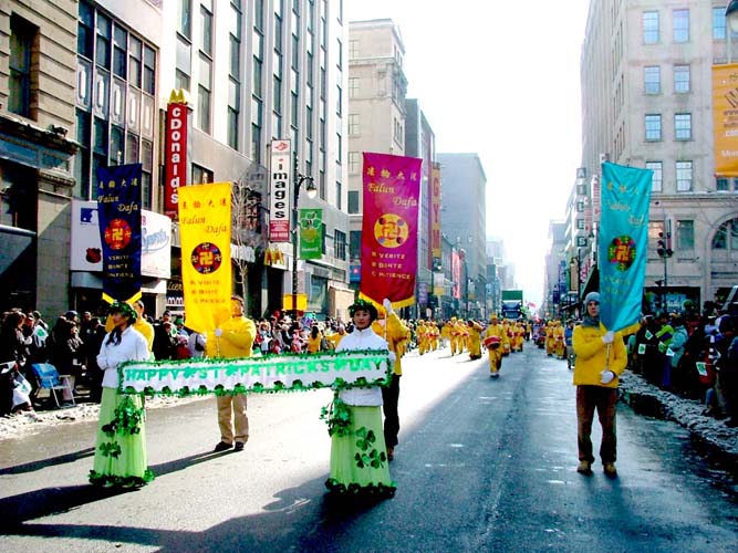 【明慧网2005年3月16日】(明慧记者肖妍报道)2005年3月13日,在加拿大的文化之都蒙特利尔市举行了一年一度的圣派翠克节(St-Patrick’s Day)盛大游行,迎接春天的到来。在近百个参加游行的团体中,法轮功学员的队伍是唯一的华人团体,格外引人注目。