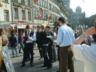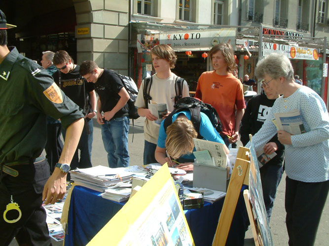 【明慧网2005年3月22日】2005年联合国人权会议期间,瑞士国会会议也在首都伯尔尼(Bern)召开。为让更多人了解发生在中国对法轮功学员的残酷迫害,瑞士学员们继3月16日在日内瓦联合国门前举行反酷刑展之后,于17日在首都市中心再度举行反酷刑展。