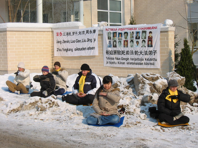 6日中午,虽然已進入三月,但因今年欧洲的天气异常,仍然是大雪覆盖天气寒冷,法轮功学员们冒着严寒坐在雪地上发正念,以和平的方式抗议江氏集团对修炼“真善忍”的法轮功学员近六年的残酷迫害,目前已获知在中国大陆遭迫害致死的法轮功学员已达1454人,而与他们相连的亲友、子女和长辈又何止千千万。停止迫害的呼声发自每个法轮功学员和他们的亲朋好友的肺腑,同时也来自中国大陆和世界各国的善良人民。