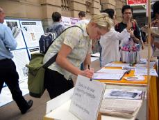 有一天,一个西人青年来到学员面前说:“我上周经过你们的真象展位时,听了你们的介绍,回去后也看了你们的真象资料,随后我又上网深入了解了有关法轮功在中国被当局残酷迫害以及目前的情况,我十分敬佩和支持你们为正义、为信仰和反迫害而坚持不懈的和平请愿行动。你们用自己的时间,甚至金钱在做着一件这么伟大的事,完全是为了他人得救。今天,我专程来找你们,是为了向你们表达我的心意——我的心是与你们连在一起的。我完全站在你们一边,共同去为争取信仰自由而努力。请接受我对法轮功衷心的祝福!”
