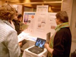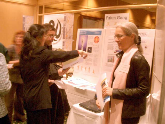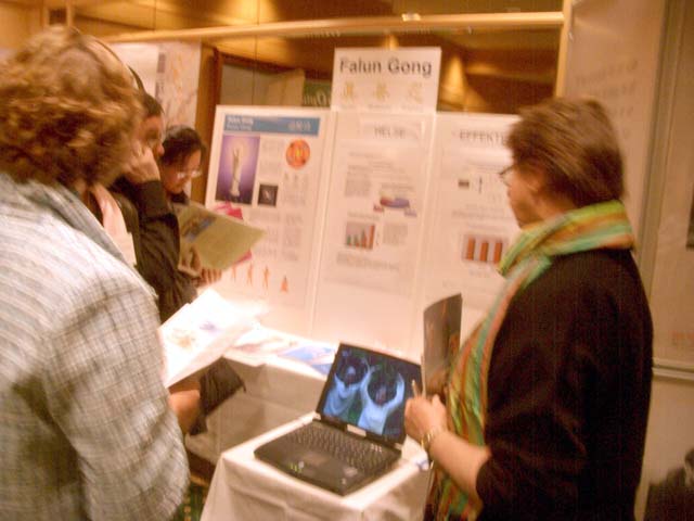 人们可以从计算机屏幕上看到优美舒展的功法,同时也可以看到法轮功学员的功法展示。许多与会者表示出兴趣,他们驻足观看展位,提出许多问题。一些与会者看到功法展示后说:”仅仅看着你炼功,心里就感到特别舒服”。当人们得知法轮大法的一切活动都是免费的,更是发出赞叹。有些人希望能在自己工作的地方有机会炼法轮功。还有的人希望能得到“普度”的音乐。人们也通过交谈了解到了法轮功在中国遭到的无理镇压。