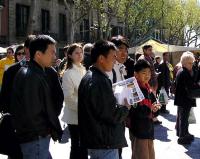 在等候签名的队伍中,有来自不同种族的人,也有中国人。有几位中国人路过这里时看到酷刑演示和图片,不由停住脚步观看,一位学员上前递给他们真象资料说:“法轮功遭迫害是千古奇冤,全世界都知道,你们知道吗?”他们说:“听说过。”学员说:“现在这个迫害还在继续,已经有很多人被迫害致死致残,从八个月的婴孩到七、八十岁的老人都不放过,……”其中一位中国人忍不住了,愤愤的说:“共产党一贯就是那一套,把好人往死里整。”另一个说:“可不是,坏透了!要不中国人怎么都想往国外跑呢。”