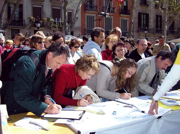 2005年4月10日,西班牙法轮功学员在巴塞罗那(Barcelona)市中心最繁华的兰布朗大道举办了反酷刑展以揭露江氏集团在中国对法轮功的残酷迫害。上午10点,学员们到达兰布朗大道,刚摆放好部分图片,其它一切都还没有布置好时,就不断有人过来观看图片,询问发生了什么事。当知道了在中国正在发生的对法轮功的迫害后,人们纷纷签名表示声援法轮功学员,呼吁停止迫害。