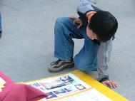 ![]() 认真阅读真象资料 | ![]() 男孩久久凝视揭露迫害的展板 |