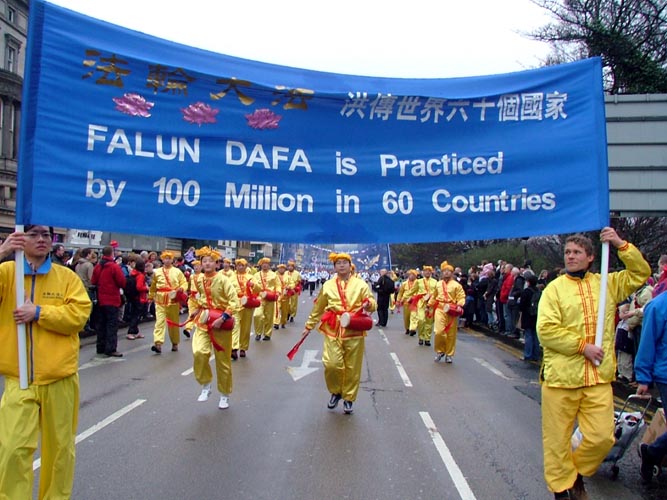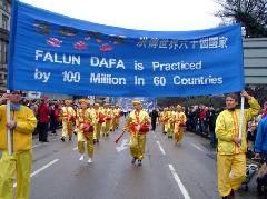 法轮功学员高举着“法轮大法”、“世界需要真善忍”、“法轮大法洪传世界60个国家”等巨大横幅,前面是14位女学员身着中国传统服饰,双手舞动彩绸翩翩起舞,后面是由20名男学员组成的腰鼓队,威风凛凛。沿途都有法轮功学员向两旁的观众散发真象传单和学员们亲手做的莲花。