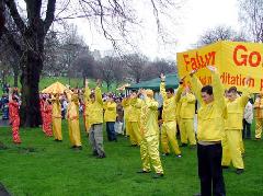 游行结束后,法轮功学员们在游人如织的公园里举行画展并演示祥和优美的五套功法,引来许多游人观看,也有英国的电视台来摄影。