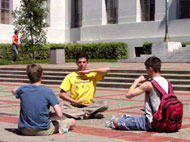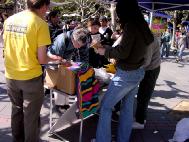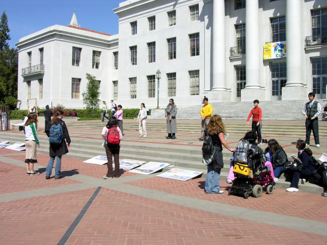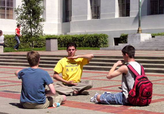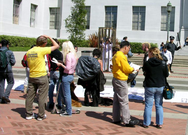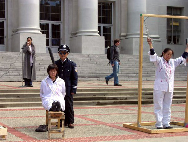 这两天,在伯克利大学校园里的学生会广场的一侧,北加州湾区的部分法轮功学员,有的身穿血迹斑斑的白衬衫,在伯克利校园里扮演在中国国内遭受酷刑折磨的同修,还有几位学员身穿绿色警服,装扮成中国警察(在中国大陆也称公安),恶狠狠的手持棍棒站在一旁;另一侧,部分学员在悠扬的炼功音乐下,演示着祥和的法轮功五套功法;形成了鲜明的对比。这也成为校园里的一“独特”风景。