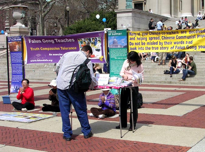 ![]() 在哥伦比亚大学校园内举办反酷刑展 | ![]() 哥伦比亚大学生在支持反迫害的请愿信上签名 |