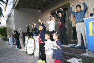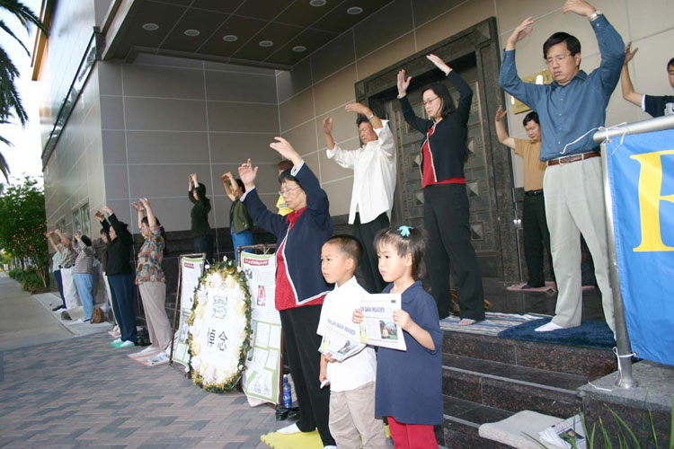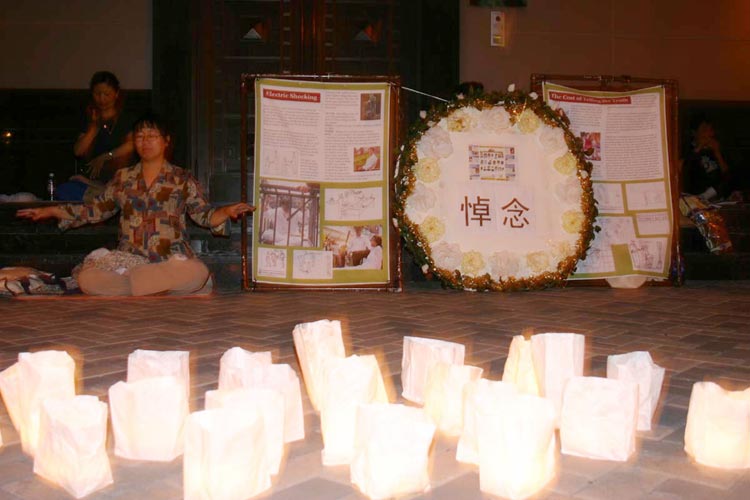 1999年4月25日和平上访至今已有六周年,2005年4月19日傍晚六点至九点,休士顿法轮功学员在中领馆前举行和平请愿,以此来纪念这个特殊的日子。在中领馆前,有纪念的花圈,揭露酷刑的图片,横幅等等,还有在夜晚中闪亮的烛光,学员静静的炼功、发正念,小弟子也加入了这个行列。路过的汽车中,有时候可见到一些人在拍摄,他们留下了这难忘特殊的情景。