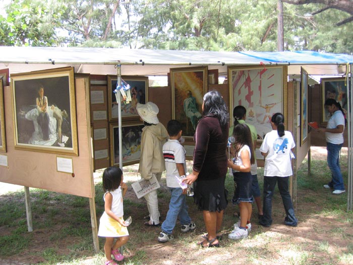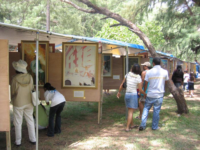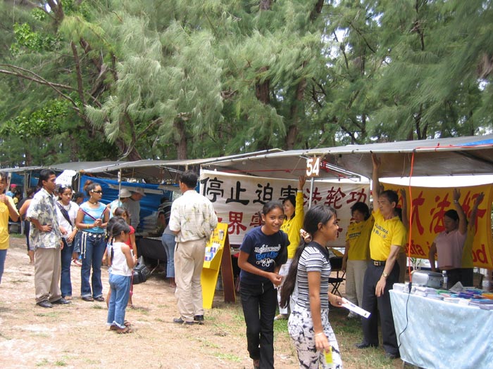 【明慧网2005年4月22日】火树节是塞班一年一度最盛大的文化艺术节。2005年4月15-17日火树节期间,塞班岛的法轮功学员与远道而来的台湾、马来西亚的同修一起举办了以“真、善、忍美展”为主题的洪法活动。