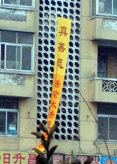 【明慧网2005年4月23日】将制作好的条幅用牛皮纸包好(因牛皮纸和许多楼房的颜色相近,不易被发现):包之前要将条幅下面配好重在卷起,快卷到上边留约半尺,垫上牛皮纸继续卷到上端,用线绳先系好。另用二根一尺左右的尼龙线将二根线头集中到一起(不打结)固定在盛水的小器皿中(或冰箱用的制冰块小盒)冻成冰砣,另外二根线头散开。到达选好的挂条幅的地点后,将条幅事先系好的线绳取下,把冻成冰砣的尼龙绳散开一段系在条幅上挂好,如想让其加速融化,可将包好细盐的方便袋底部扎些小孔覆在冰砣上,这样便完成了挂放条幅。待冰砣融化,线头散开,条幅自动展开。此法春、夏、秋、冬(只要不是太冷)都可作。夏天可将冰砣用一泡沫制成的保温盒携带(夏天冰砣稍大些)。