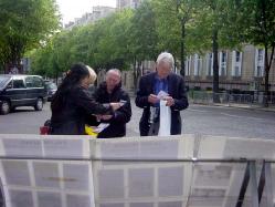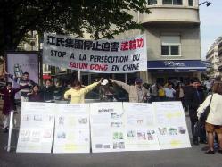 在纪念的“4.25”活动中,法国学员在中使馆前静静的炼功,发正念,一些学员向行人发放资料并讲述六年前“4.25”的真象。法轮功学员的横幅和展板在中使馆门前显得格外醒目,吸引了许多过路人的驻足观看。一位法国著名航空运输公司的经理知道真象后说 :我们现在正在和中国做生意,我和中国外交部长的私人关系很好,我会想办法帮助你们。他还主动把他的名片留给了学员。有的人对法轮功很同情,对学员说,“加油啊 !”还有的人对功法很感兴趣,并询问具体学功地点和阅读书籍的方法。