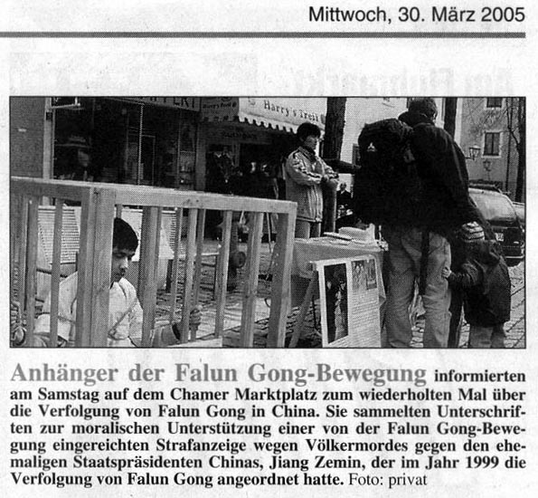德国卡姆市学员继在当地连续开展洪法讲真象活动后,近来深感有义务,有条件到周边城市更广泛的传播法轮功真象。所以在三八妇女节来临之际,申请了在施特劳宾市的法轮大法信息日。在申请过程中虽然遇到了不小的干扰,学员们还是以正念正行在活动前一天获得了许可,同时当地报社也迅速将活动的预告刊登在第二天的报纸上,使读者们及时了解法轮大法信息日的主旨,并前来签名支持反迫害。