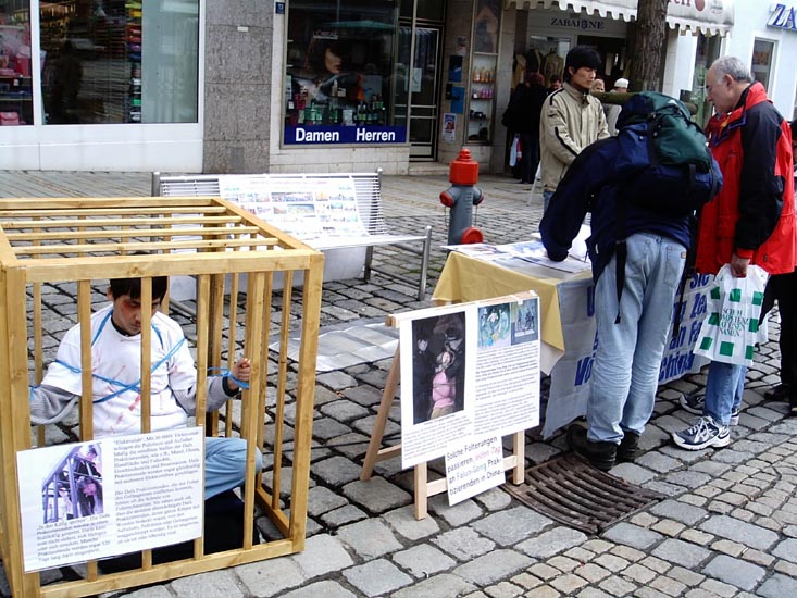 三月的最后一个周末,法轮功学员决定办反酷刑展。活动前一天,阴雨连绵不停。可是反酷刑展的当天,就在学员们所有准备工作就绪的时刻,乌云散尽,阳光照進了市中心的马克特广场,暖洋洋的。复活节里匆忙购物的人们在不能躺下也不能站直的小笼子前停住了脚步,仔细阅读张贴在笼子一角的酷刑手段的说明。然后走向展台,签名支持审江,表示对法轮功学员道义上的支持。