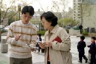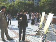 星期五在阳川区厅,有慰问残疾人的活动。法轮功学员们也在此集体炼功,旁边摆放着揭露大陆法轮功学员受迫害的照片,这些与真善忍国际美术展溶为一体。一名少年在看完画展后感觉非常好,第二天领着朋友来参观。有的孩子看了真象画作,非常悲伤,没来得及看完,就哭着回去了。还有一名看过展出的女士说,她的女儿是中学三年级学生,她知道法轮功是门祛病健身的好功法,偶然接到资料了解真象后,对她震动很大,并在学校里发表了禁止迫害人权的发言。