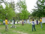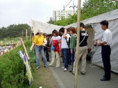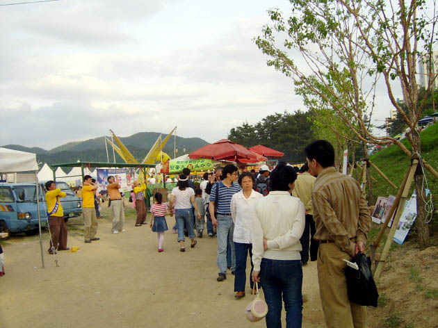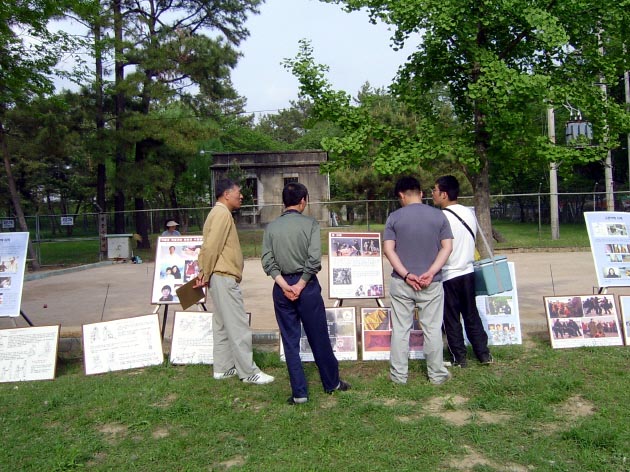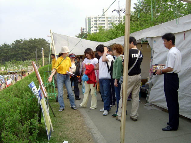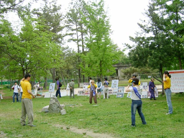 2005年4月29日到5月2日大会期间,法轮功学员们在体育馆前的树林里摆放好了图片展板和签名台。由于图片展区的前后有跆拳道和摔跤竞技场,从而可以尽情向各地的选手和游客们讲真象。悠闲的游客们在树荫下观看真象图片,听学员们的说明,他们为中共江氏集团的邪恶镇压而愤怒,而后又欣然为营救法轮功学员高成女而签下自己的名字。