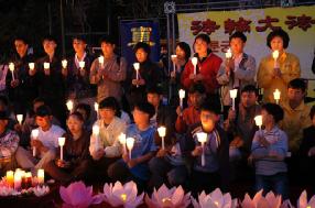 两个多小时的音乐会和炼功示范节目很快就过去了,夜幕降临了,很多人还依依不舍的不肯离去;最后,有的观众与大法弟子一起,手持蜡烛,以沉重心情悼念为坚持真理在迫害中失去生命的法轮功学员,并以合唱的 《为你而来》圆满结束了活动。