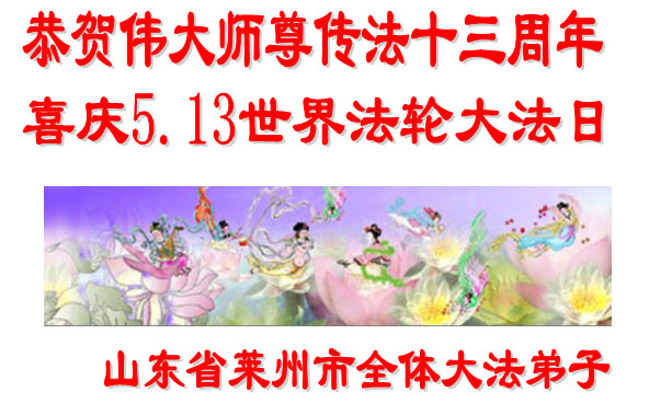 在喜庆2005年5月13日世界法轮大法日到来之际,山东省莱州市全体大法弟子恭贺慈悲伟大的师尊传法十三周年!向师尊致以最崇高的敬意,感谢师尊的慈悲苦度!