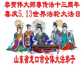 在喜庆2005年5月13日世界法轮大法日到来之际,山东省龙口市全体大法弟子恭贺慈悲伟大的师尊传法十三周年!