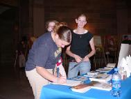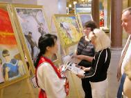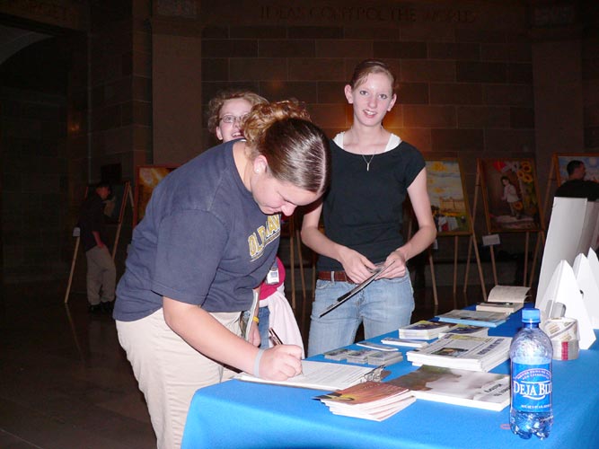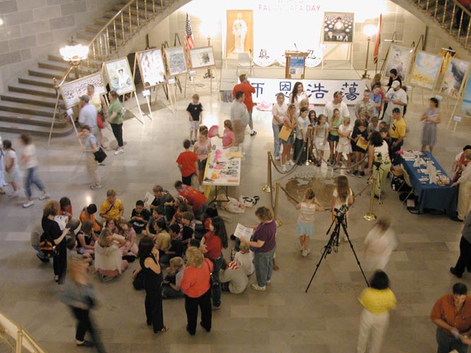 一天之中,来看画展的人络绎不绝,有州政府的参议员,工作人员,来政府大楼参观的学生和老师,及来此游览的民众。这些精美的绘画展示了法轮大法的祥和美好,大法弟子的坚忍不屈以及中共非人性的疯狂野蛮。这些画深深的震撼着观众的心,许多人在画前驻足良久。有很多人与学员们交谈,索取真象资料,对法轮功学员表示理解和支持,谴责中共的暴行。了解真象的人们纷纷签名呼吁停止在中国大陆的迫害