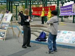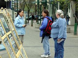 ![]() 法轮功学员向过路行人讲真象,善良的人们简直不敢相信中共竟会迫害如此善良的法轮功修炼者。 | ![]() 中午休息时间,过路行人在观看法轮功图片展 |
