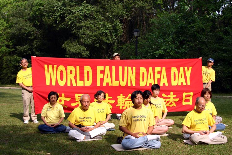 2005年5月14日星期六上午,休士顿的法轮功学员在市中心的麦莫内公园(Memorial Park)举行活动,庆祝第六届世界法轮大法日,恭贺伟大慈悲的师尊54华诞,以及师尊传法13周年。