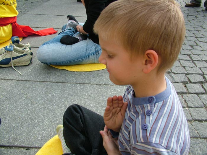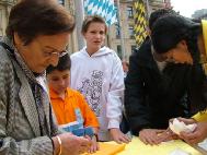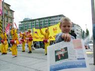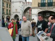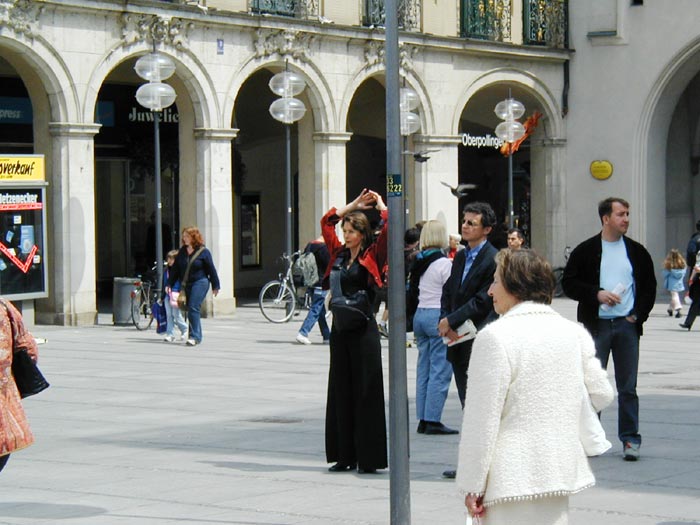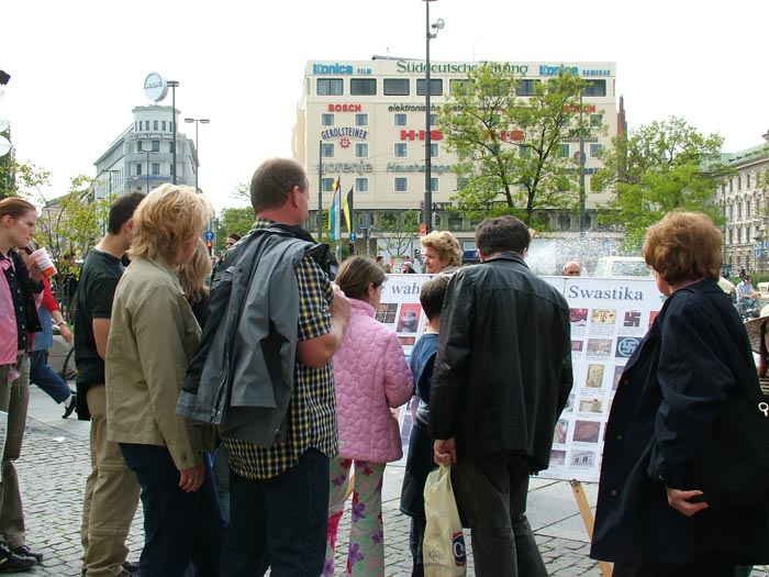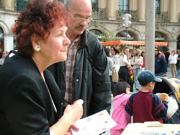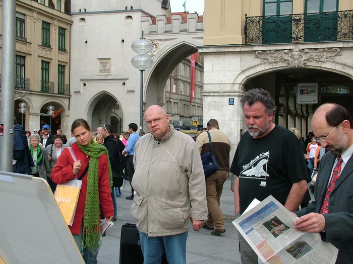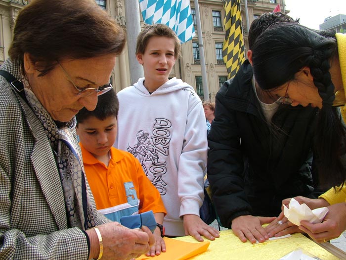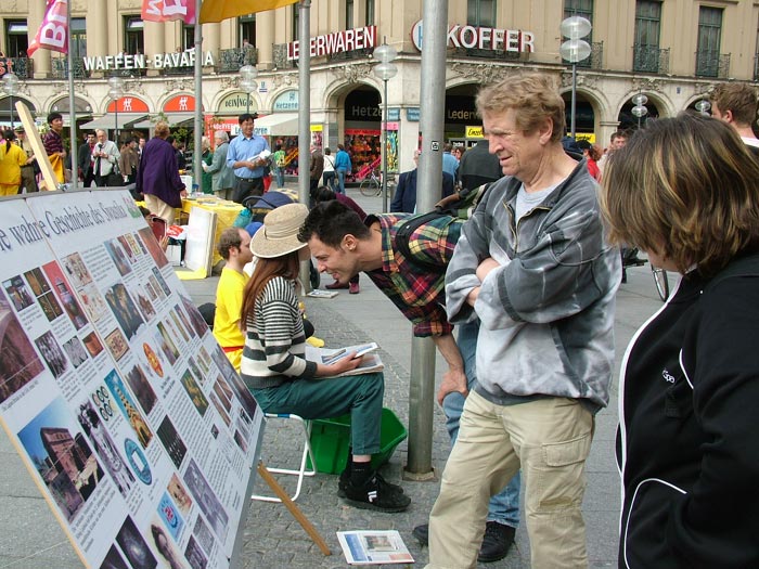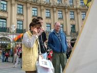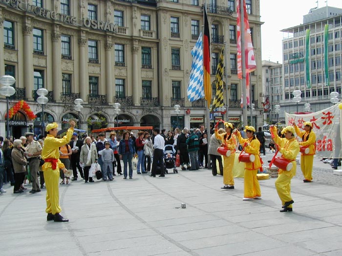 这是发生在2005年5月13日德国慕尼黑卡尔斯广场(Karlsplatz)的一幕,在世界法轮大法日来临之际,来自巴伐利亚州的法轮功学员举办了庆祝活动。当参加腰鼓表演的法轮功学员刚刚抵达广场时,就引来了无数好奇的目光,那对老夫妇更是围着学员问长问短,在得知表演还得等一段时间后,他们干脆在一旁找地方坐下,耐心的等待。