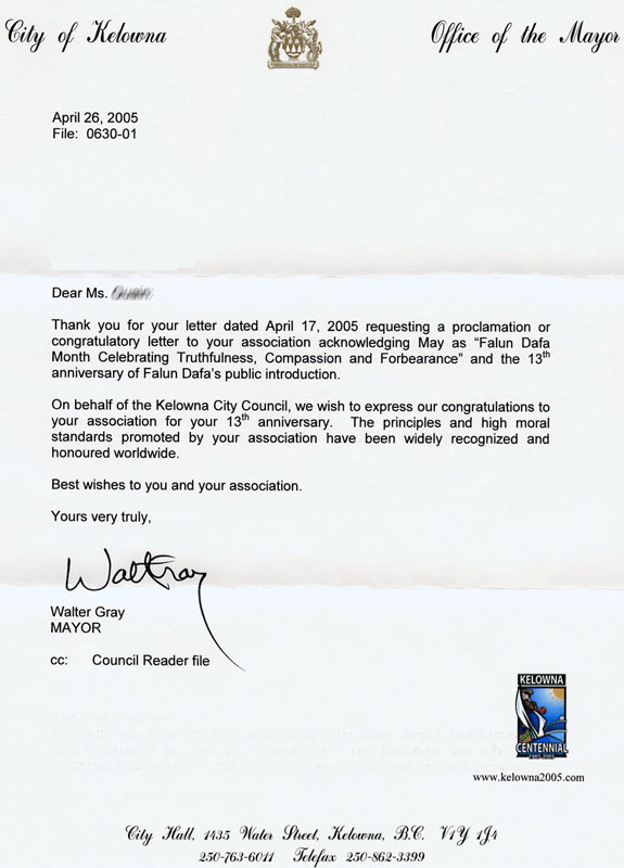 市长并感谢学员来信申请嘉奖5月为“洪扬真、善、忍法轮大法月”及庆贺法轮大法洪传13周年。