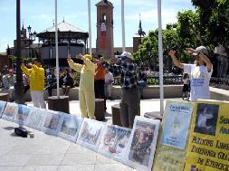大家来到广场正中心,准备在一侧摆放法轮大法洪传世界的图片,另一侧摆放法轮功学员在中国受迫害的图片。第一张大法洪传世界的图片还没放稳,就已经有人过来要求学功了;当学员们了解到这里的人们很多都没有听说过法轮功时,大家的心真是很急,虽急,但配合的却井然有序,很快各就各位:演示功法的、发传单的、演讲的、在签名桌前服务的……温暖和煦的春风则将优美祥和的炼功和“普度”“济世”音乐飘向广场四方,吸引着一群群游客和市民前来认识和了解法轮大法。