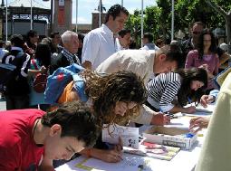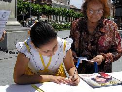 一位先生在看了受迫害图片后立即签名支持法轮功,并叫他的家人也来签名,因为广场上人很多,一时找不到他的家人,便着急的借来学员的扩音器呼叫:“爱莲娜,快到这里来签名支援法轮功!”他的呼叫又引来更多的人前来签名声援法轮功。