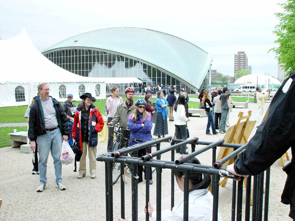 大型铁笼中两名身穿囚服,脸部被化妆成青一块紫一块、伤痕累累的女士正在不停的缝补和整理各种出口产品如玩具、服装和卫生筷等,这就是模拟酷刑展的一角。“追查迫害法轮功国际组织”赶制了八幅巨型展板向人们展示已倾销到国外,在中国劳教所强迫法轮功学员生产的各种产品,并配有图片及说明。与会者为模拟酷刑展所震撼,很多人表示虽然知道中国存在奴役劳工现象,却不知有如此严重,并用以迫害信仰团体-法轮功。