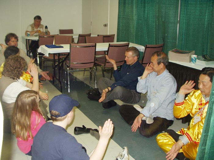 许多人经过我们的展台时或跟着学功或观看电视里的功法演示,她们能感受到我们很强的能量场,觉得很舒服。因展台前学功的人太多,地方不够,只好一趟趟的来看是否有空位学功。