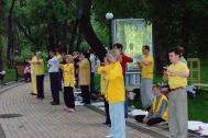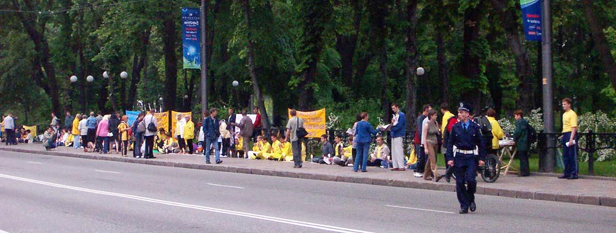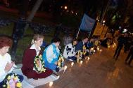 于乌克兰法会期间,为了纪念在中国大陆被邪恶中共政治集团迫害死的2000多名大法弟子,5月21日晚,在基辅市中心的中使馆前近百名来自乌克兰大法弟子和俄罗斯、波罗的海等海外弟子一起進行了烛光守夜活动。他们来到中使馆前抗议中共集团在中国大陆针对法轮功的迫害。