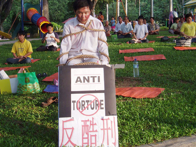 ![]() 反酷刑演示 | ![]() 记者采访 | ![]() 学员们集体炼功,发正念 |