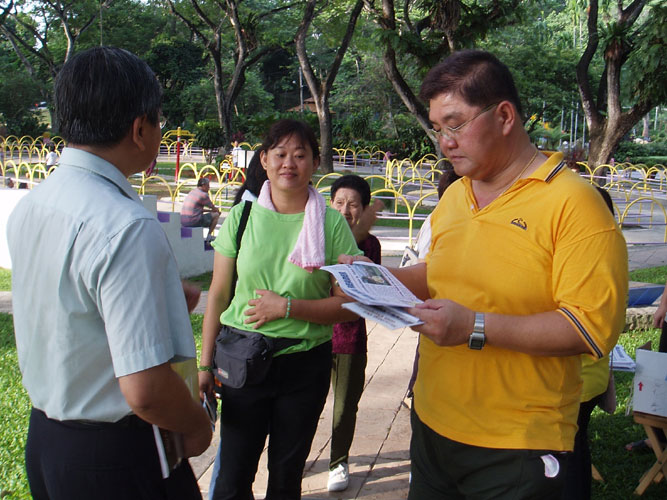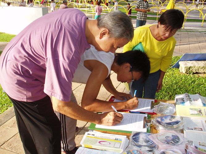 当到现场还未准备妥当之际,许多晨运者及休闲人士已经围上观看和想了解到底发生何事。学员们马上开始讲真象的工作,让这些以及陆续到来的人士了解真象,他们在明白真象后,纷纷在停止对法轮功迫害的征签簿上,各自写下了对良知和正义的抉择。有些在聆听真象的过程中红了眼眶。